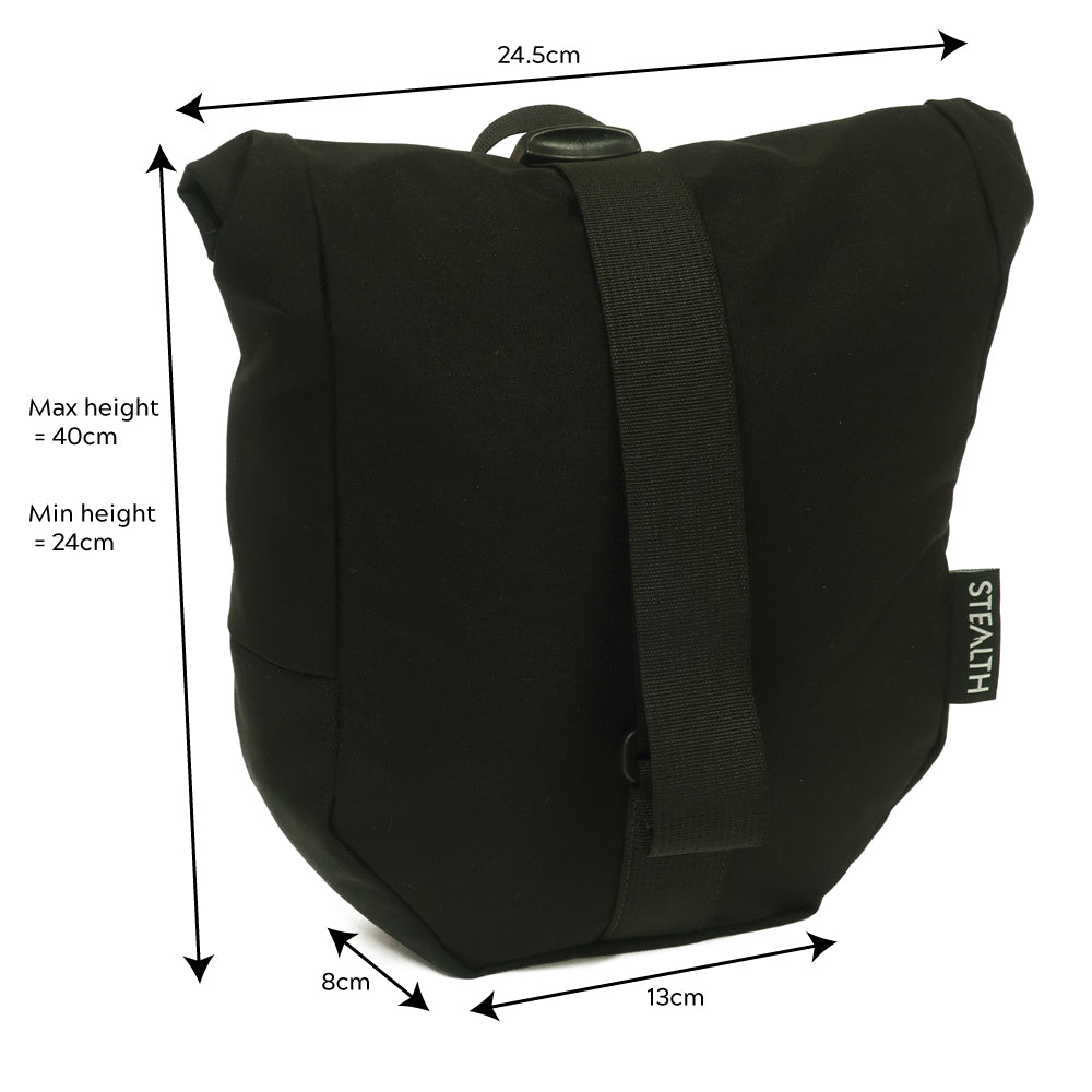 - Max volume is 8L per pannier with 3 rolls on the roll top