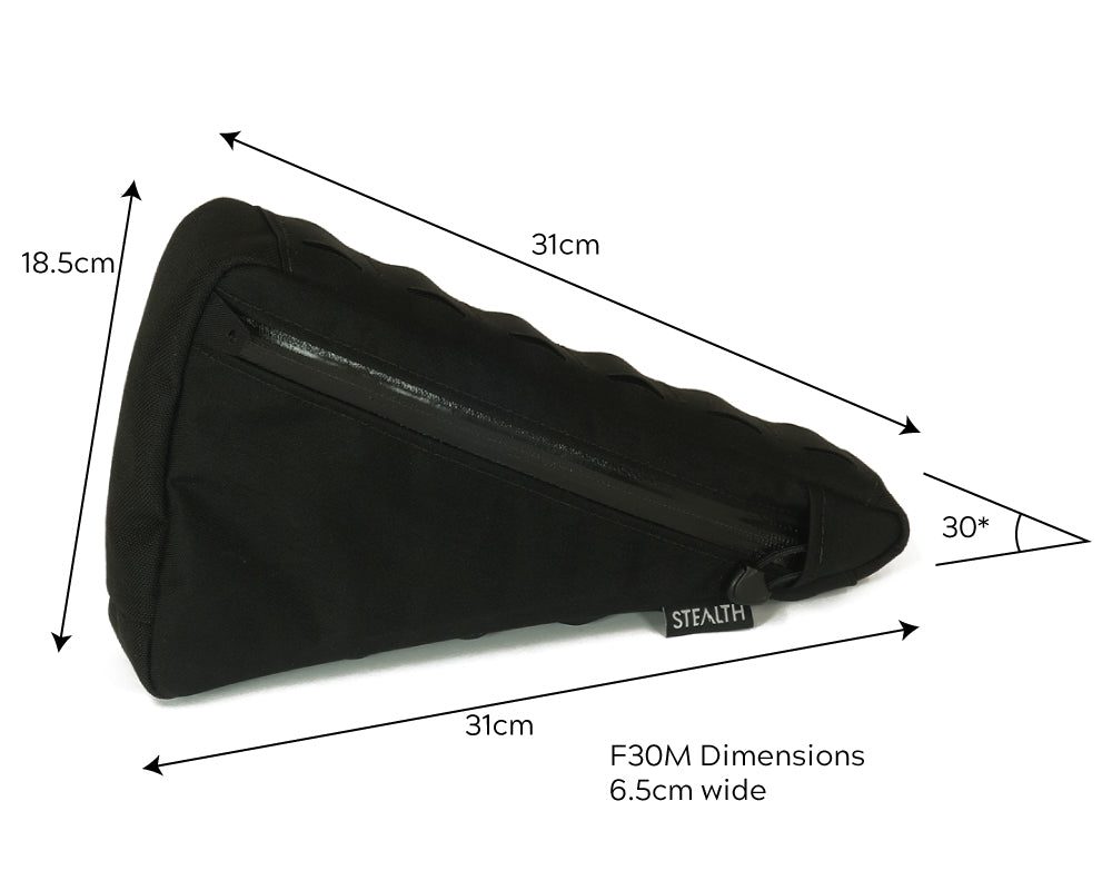 The F30M is a 'standard' size frame bag from Stealth. Designed with a 30 degree angle between the top tube and down tube, this bag will fit a good proportion of the mountain bikes on the market today.